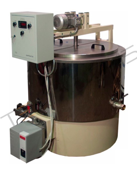 Устройство: Газовые пищеварочные котлы КПГ-160 являются стационарным оборудованием и представляют собой сборно-сварную конструкцию. Варочная емкость изготовлена из листовой нержавеющей стали толщиной 2 мм (стенки) и 3 мм (дно), герметично соединена с нагревательной рубашкой и парогенератором. Варочный сосуд закрывается крышкой, состоящей из двух половин. Нагревательная рубашка и парогенератор – пространство между варочной емкостью и внешней стенкой, заполненное теплоносителем — маслом ПМС-100. Под парогенератором расположены газовая горелка и кран для слива теплоносителя. На нагревательной рубашке установлены датчики температуры теплоносителя и продукта. Температура теплоносителя задается и контролируется измерителем-регулятором, установленным на пульте управления. Опционально на кронштейне устанавливается мотор-редуктор с перемешивающим устройством. На котле предусмотрен кран с проходом 40 мм для слива готового продукта. Опционально возможен проход 100 мм.
