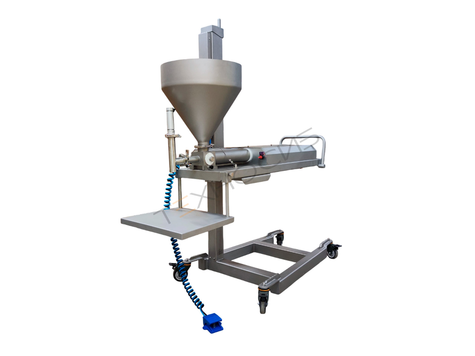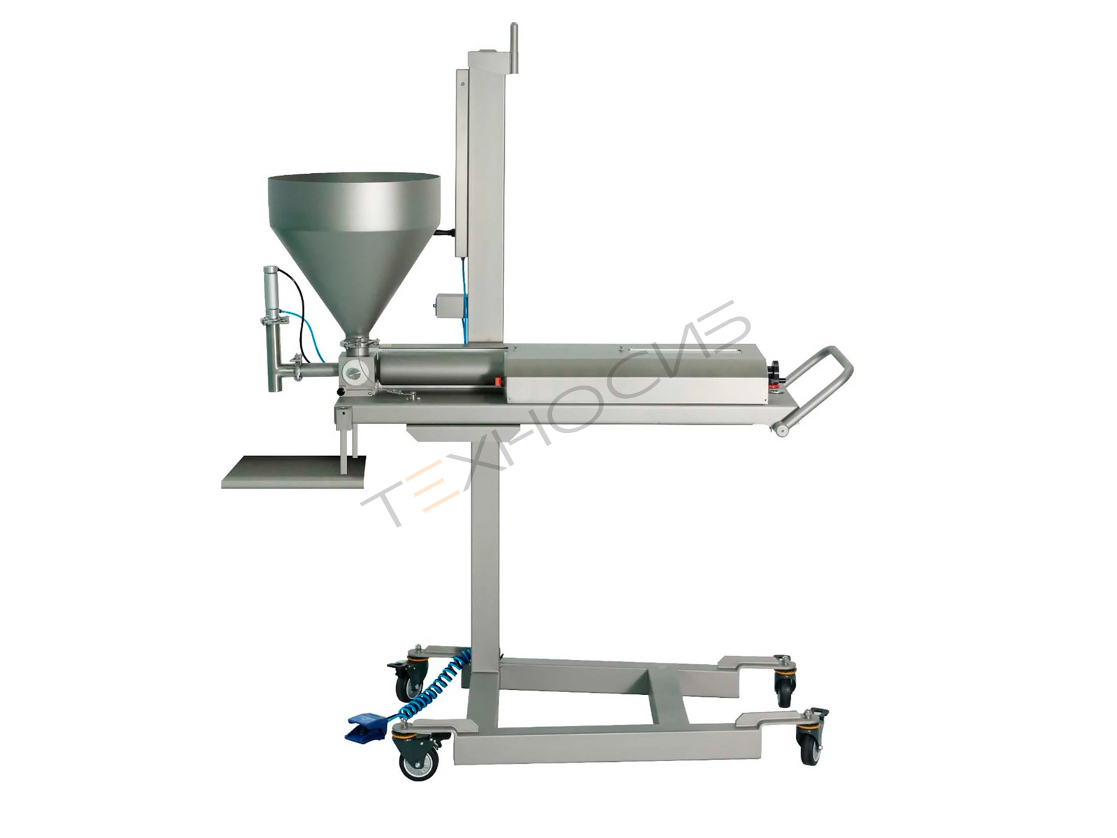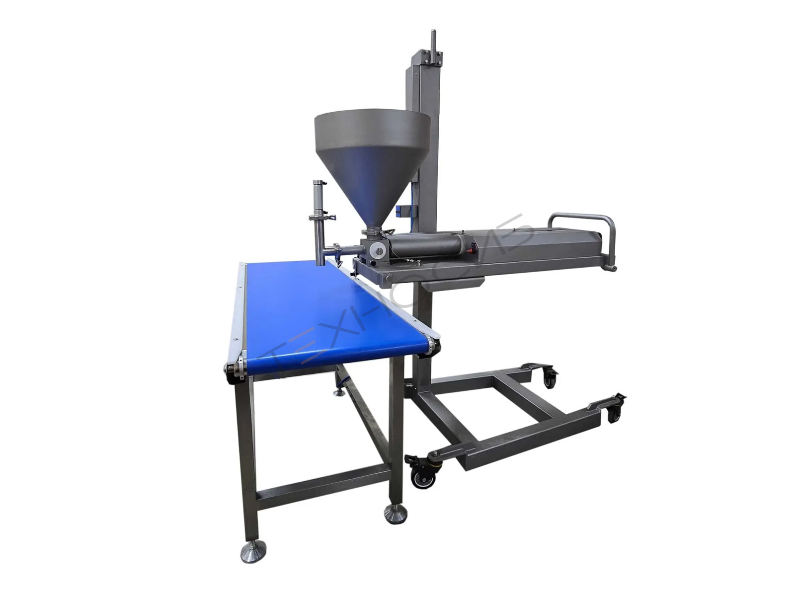 При необходимости депозитор кондитерский может быть дополнен автоматическим подающим транспортером шириной 300 мм с фотооптическим сенсором для автоматической дозировки продукта. Для удобства перемещения оборудование установлено на колесики с упорным тормозом, а опциональный держатель шланга снижает нагрузку на оператора при длительной работе.
