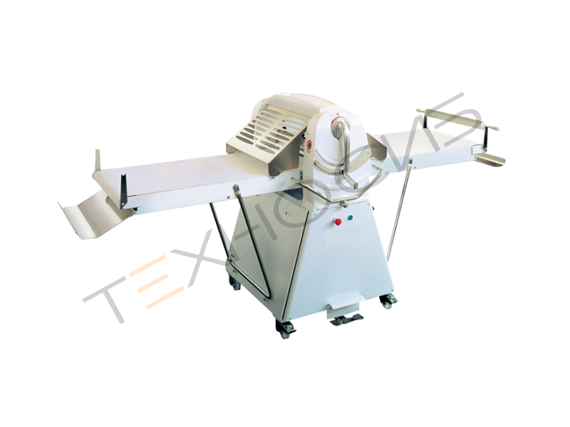Толщина раскатываемого теста регулируется с помощью ручки. Транспортеры снабжены решетками безопасности. При поднятии решетки машина выключается. Полотна транспортеров выполнены из материала неклейкого для теста. В механизме привода транспортеров использованы обгонные муфты повышенной надежности. Машина работает плавно и тихо. Машина снабжена двумя деревянными скалками для свертывания теста.