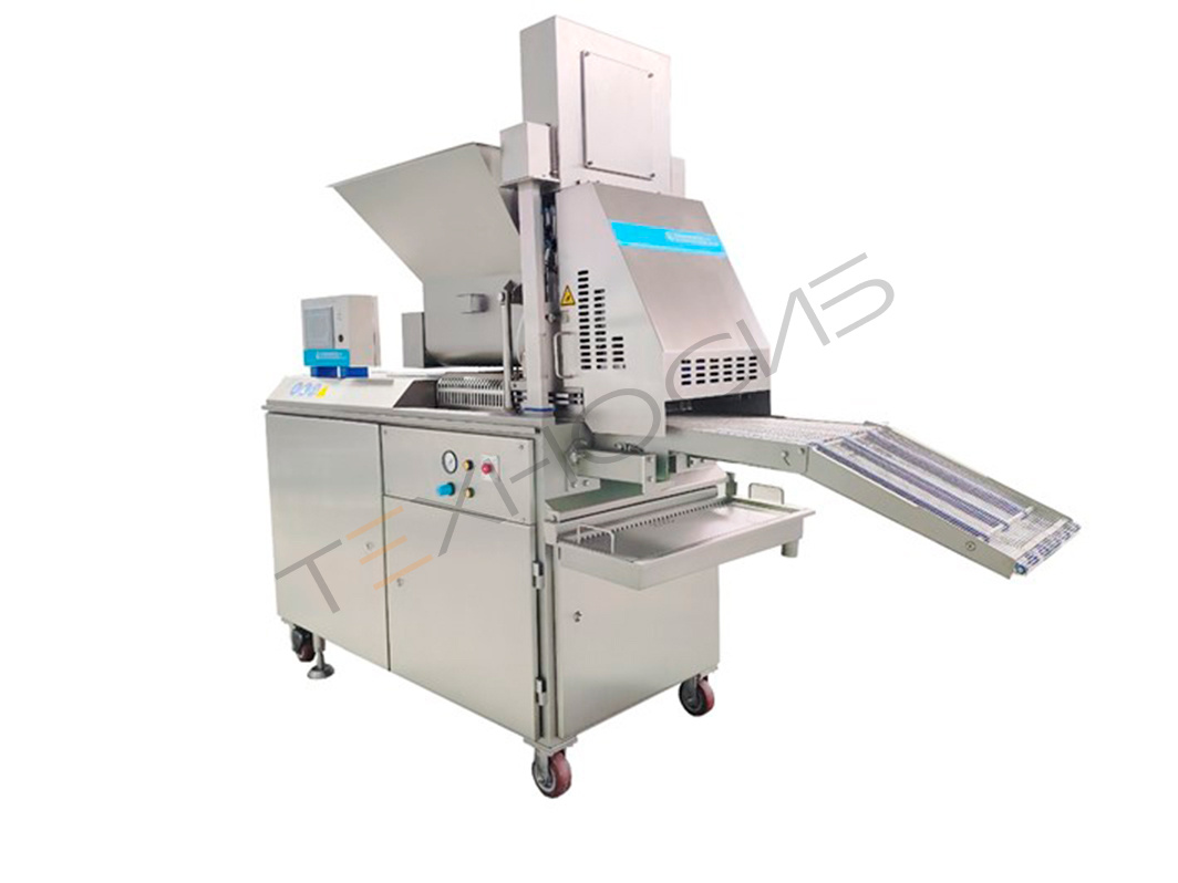 Сырье подается в бункер, после чего гидравлическая система под давлением направляет массу в формующую матрицу (пресс-форму). После заполнения формы изделие аккуратно выталкивается на ленту транспортера и передается на следующий этап технологической цепочки: панировку, обжарку, заморозку или упаковку. Машина автоматически выполняет цикл: подача → формование → выгрузка.