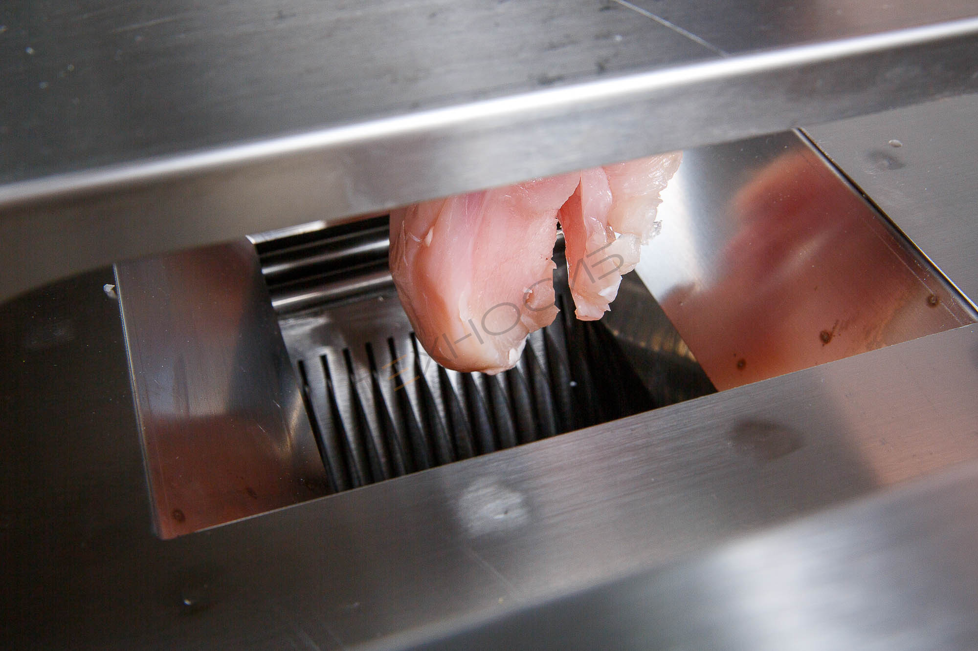 Производственный слайсер MC-TS800 (7 мм) предназначен для нарезки на брусочки различного сырья, в первую очередь – мяса. Толщина ломтика регулируется путем замены комплекта ножей. В базовой комплектации модель настроена на нарезку толщиной 5 мм. Под заказ поставляется оборудование с разной толщиной нарезки до 12 мм включительно.