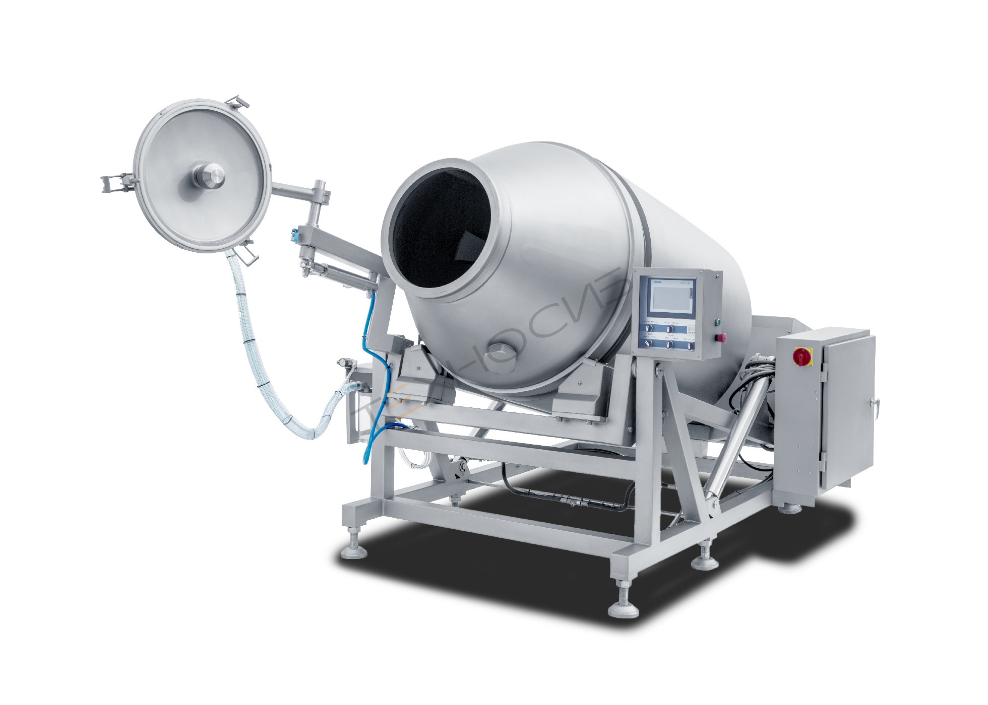 - Вместительный барабан на 2500 литров позволяет единовременно обрабатывать до 1500 кг продукции с маринадом