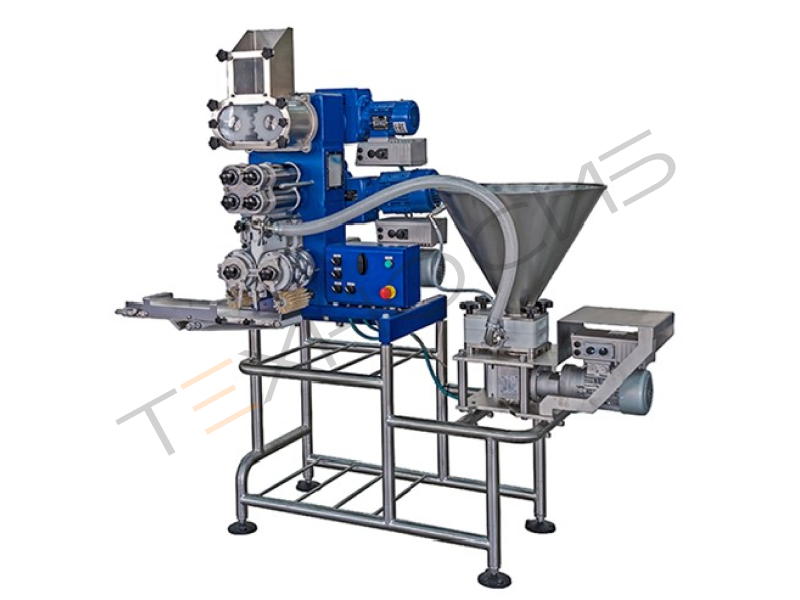 Фарш погружается в накопительную воронку фаршенасоса и по трубкам из полиамида подается в дозатор, расположенный между формующими барабанами и раскатанными тестовыми лентами.
