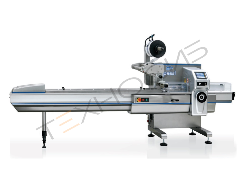 PEARL (Жемчужина) Горизонтальная упаковочная машина нового поколения, результат опыта, качественной конструкции и акцента на усовершенствование техники. Предназначена для упаковки штучных пищевых и непищевых товаров в трехшовный пакет типа «подушка» («flow-pack») со скоростью до 120 упаковок в минуту, в зависимости от продукта и типа упаковочного материала. Три независимых серво-привода на электрическом валу, полный электронный контроль главных функций, программирование, запоминание настроек, простые операции для ввода новых данных. Все главные функции по замене формата автоматизированы: установка в фазу продукта, регулирование длины упаковки, регулирование замедления, регулирование центрирования печати по фотометке, температура сварочных групп. Регулировка высоты сварочных губок механическая.