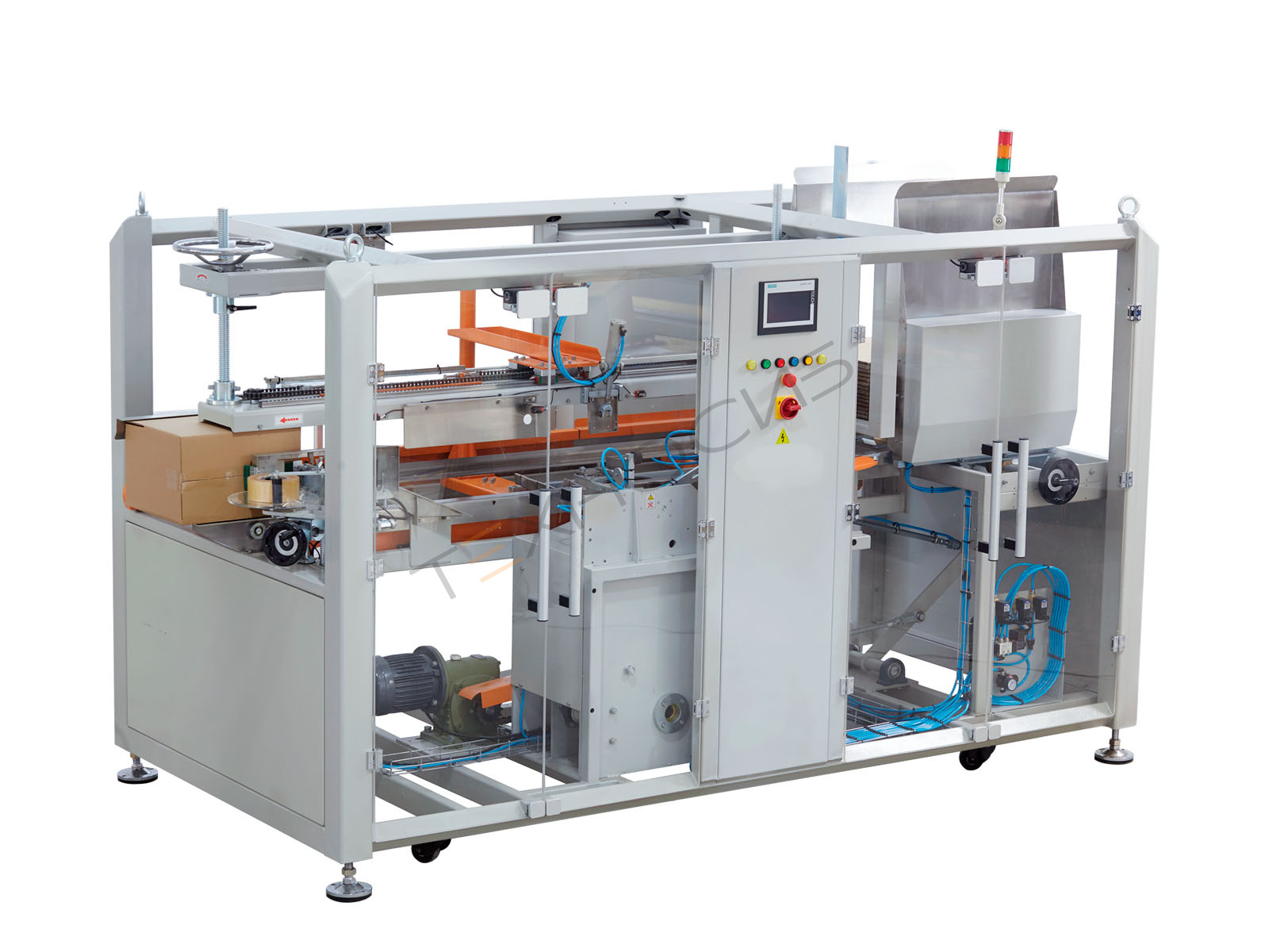 Заготовки загружаются в накопитель, после чего формирователь коробов выполняет полный цикл автоматически. Кулачковая система привода в сочетании с шатунами управляет всеми движениями механизмов и обеспечивает точную синхронизацию операций. За один цикл выполняются: забор картонной заготовки, формирование короба, складывание клапанов и заклейка нижней части клейкой лентой. Производительность достигает 50 коробов в минуту. При обрыве или отсутствии ленты срабатывает автоматическая сигнализация.