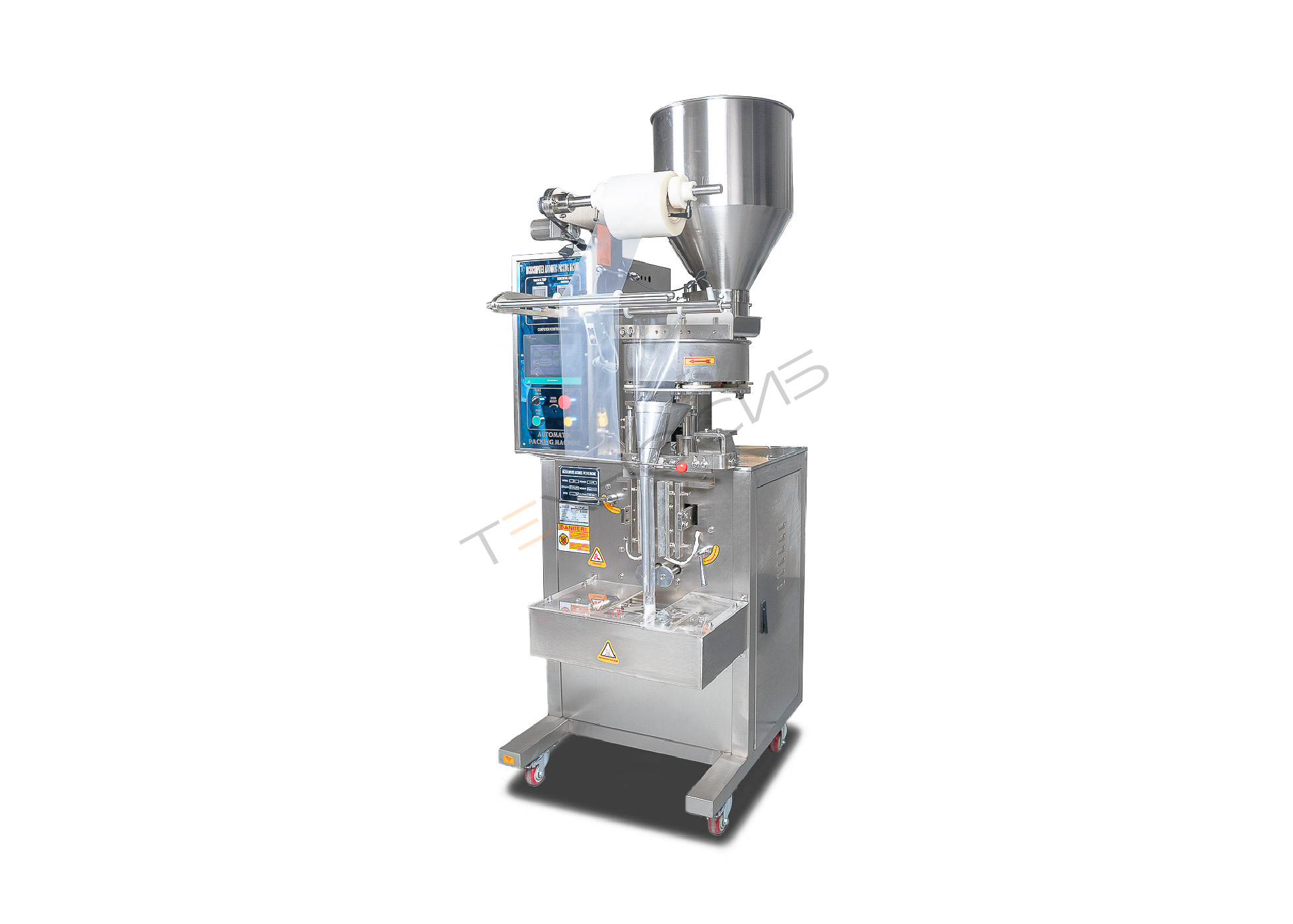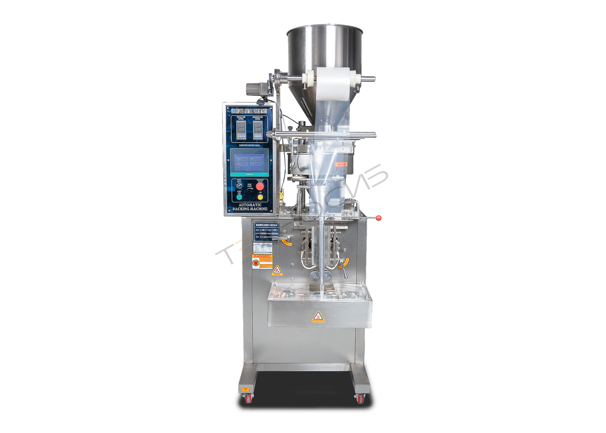Дозирование продукта происходит в пакетик, формируемый из полотна упаковочного материала (многослойные пленки, ламинированные материалы, BOPP-пленка)