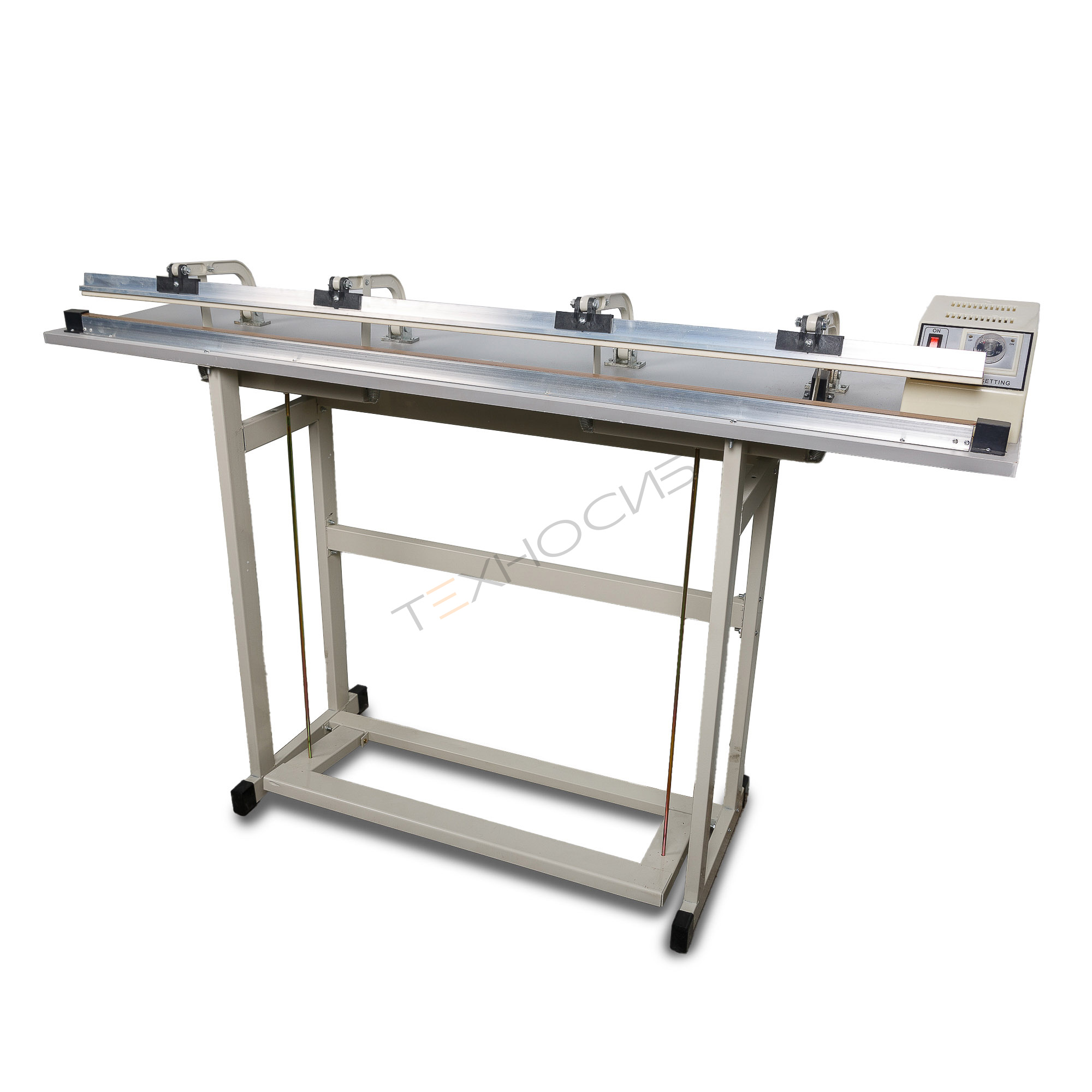 Запайщик выполнен в напольном исполнении с ножным управлением, что обеспечивает удобство работы и освобождает руки оператора. Импульсный принцип нагрева позволяет экономить электроэнергию, а механическое реле дает возможность точно настроить время запайки под конкретный материал.